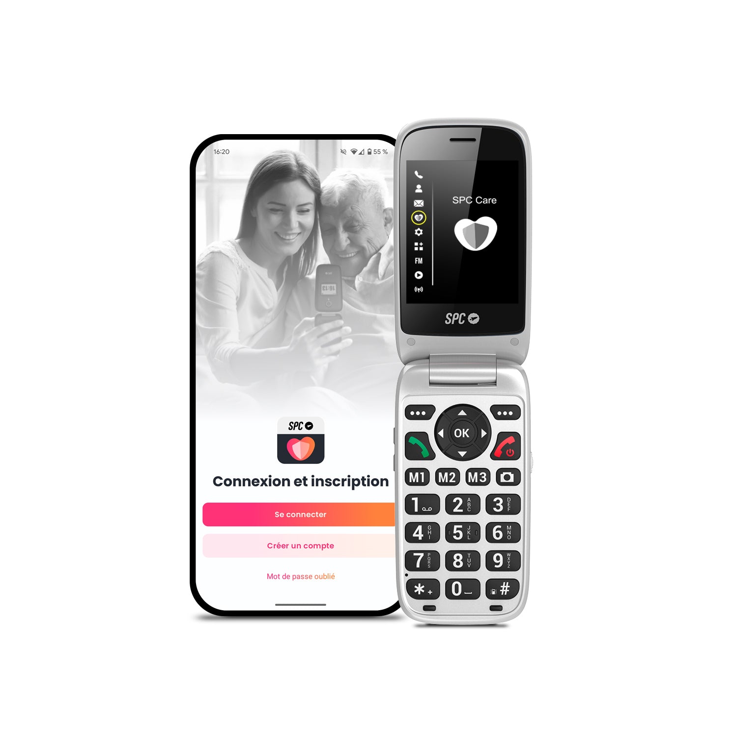 Téléphone portable pour personnes âgées compatible avec l'application de télécommande SPC Care. Avec connexion 4G, bouton SOS, 2 écrans, 3 mémoires directes et compatible avec les appareils auditifs.