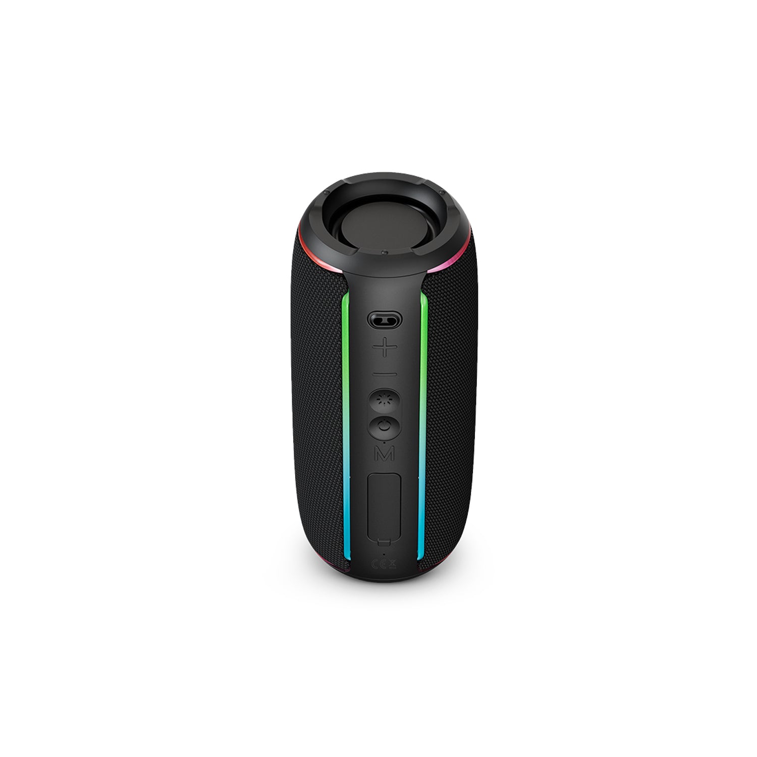Enceinte Bluetooth d’une puissance de 25 W avec deux grandes membranes pour un son sublime, lumière au rythme de la musique en option, autonomie de 20 heures, grande étanchéité et sangle intégrée pour un transport confortable.